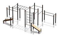 Конструкция спортивного комплекса для тренировок на улице. Представленный проект относится к сборно-разборному типу конструкций и доставляется на объект отдельными элементами, после чего собирается воедино. Основа конструкции опорные столбы, включены следующие элементы: две скамьи для выполнения упражнений на пресс, двое брусьев, разноуровневые турники, шведская стенка и рукоход. Все элементы изготовлены из качественных материалов – металл и дерево. Металлические части покрыты антикоррозийным слоем и порошковой краской.